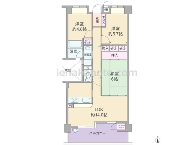 専有面積65.80平米の3LDK。センターインのプラン。玄関前に便利なトランクルーム付き。キッチンは壁付けのオープンタイプ。LDKと2部屋が続き間で、個室が欲しいとき、来客が多いときなど生活シーンに合わせて、フレキシブルに使えます。