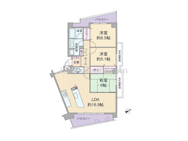 専有面積98.41平米の3SLDK。センターインで、南北両面バルコニーのため通風も良好です。共用廊下に面する居室が無く、プライバシーに配慮されています。LDKは広々20.1帖、ダイニングとリビングがゆるやかに区切られた使いやすいプラン。ウ...