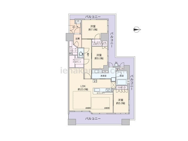 専有面積98.67平米の3SLDK。西・北・東の3面にバルコニーが付いた光あふれるプラン。玄関前に専用ポーチがあり、共用廊下に直接面した窓が無くプライバシーが確保されています。ワイドスパンのLDKは約23.0帖大と開放感があり、カウンター...