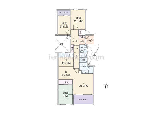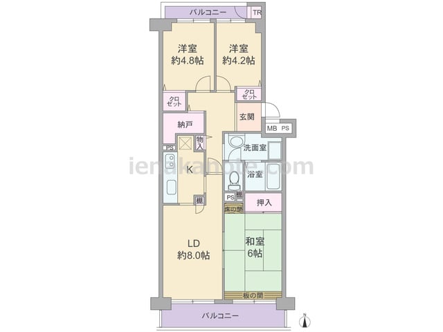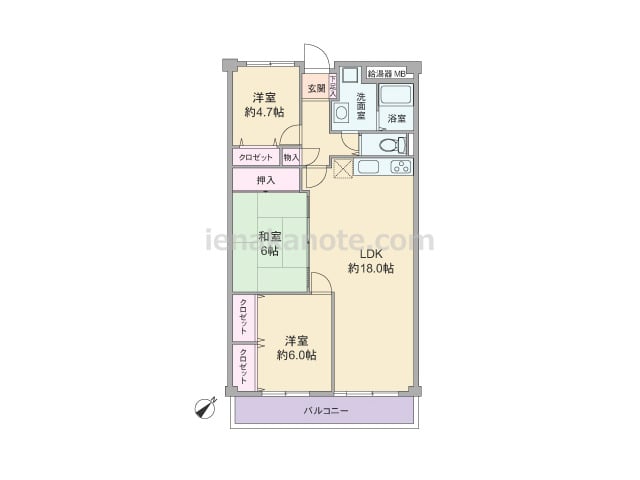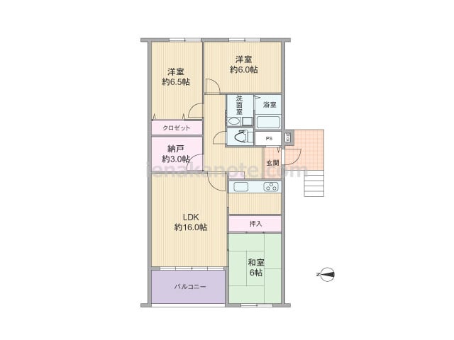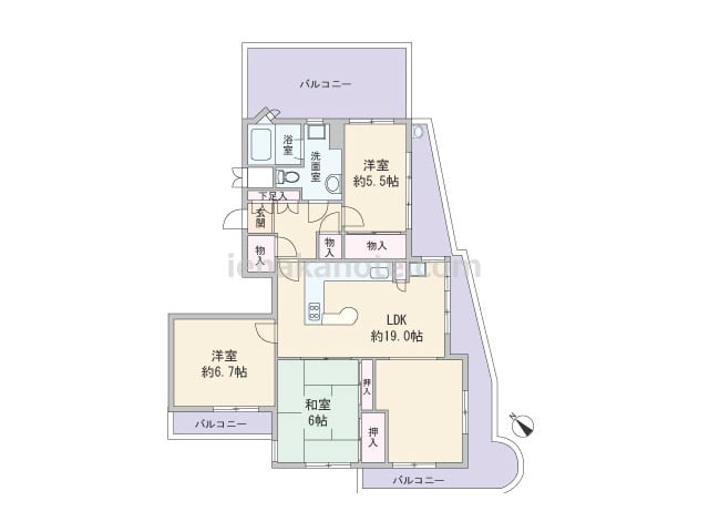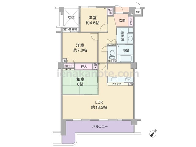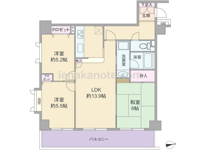 専有面積64.92平米の3LDK。室内廊下の面積が少ない・居室の広さを優先したセンターリビングのプラン。全部屋6帖以上の広さ。全部屋に窓があるため明るく、通風にもすぐれています。洋室約6.0帖には収納スペースが無く、収納家具を設けるなど少...