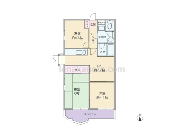 専有面積49.68平米の3DK。共用廊下に直接面する居室の窓が無くプライバシーが確保されたプラン。壁付け・オープンタイプのキッチンはダイニングから奥まって配置され、ダイニングスペースはくつろぎの空間を保つ事が可能。和室6帖と洋室約4.4帖...