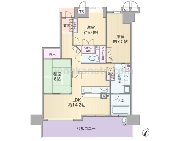 専有面積77.69平米の3LDK。玄関前にアルコーブがあり、室内廊下はクランク型で室内を見通しにくい、プライバシーに配慮された造り。LDKはゆとりの約14.2帖大。キッチンは作業しながら家族と会話がしやすいカウンタータイプで、キッチン横か...