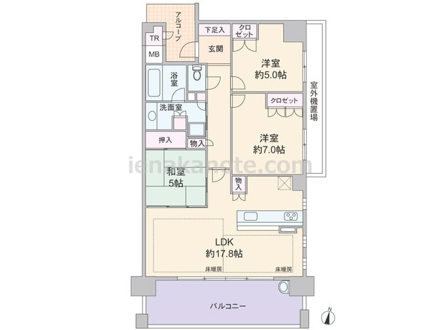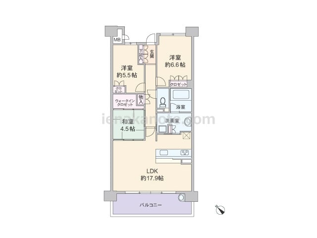 専有面積78.39平米の3LDK。共用廊下に居室の窓が面していない、プライバシーに配慮されたプラン。LDKは約17.8帖大の広さがあり、和室の襖を開放すれば空間をより広く使う事が出来ます。カウンタータイプのキッチンは家事をしながら家族と会...