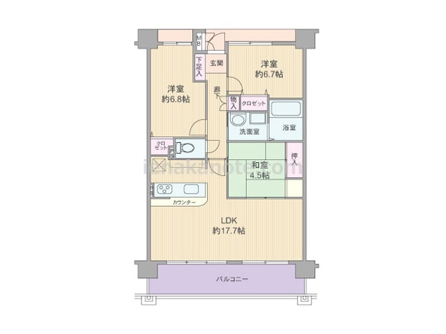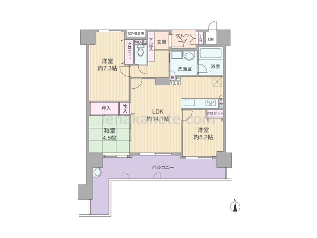専有面積73.87平米の3LDK。LDKは約17.7帖大とゆとりがあり、キッチンは家事をしながら家族と会話を楽しめる対面カウンタータイプ。和室4.5帖は2カ所から出入りでき、客間に利用したり、LDK側の襖を開放して約22.2帖大の空間にす...