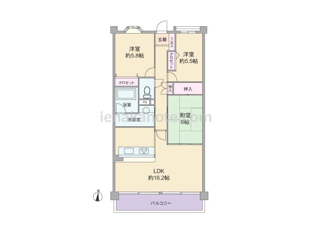 専有面積74.95平米の3LDK。LDKはゆとりの約16.2帖大。LDKに隣接する和室6帖は2カ所から出入りでき、LDK側の襖を開放してくつろぎのリビングスペースにしたり、おもちゃを置いて小さい子どもの遊び場やお昼寝コーナーにするなど、生...