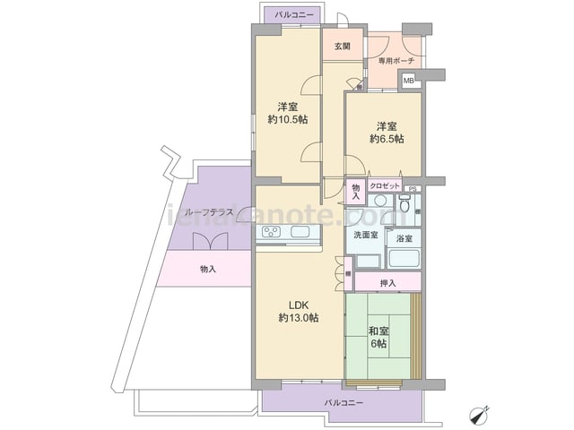 専有面積97.98平米の3LDK。玄関前にプライバシーに配慮されたポーチ付き。全部屋6帖以上の広さ。キッチンはI型の対面式で、キッチンからルーフバルコニーに出入りが可能。ルーフバルコニーには物入付き。洗面室の扉がキッチンのすぐ横にある為、...