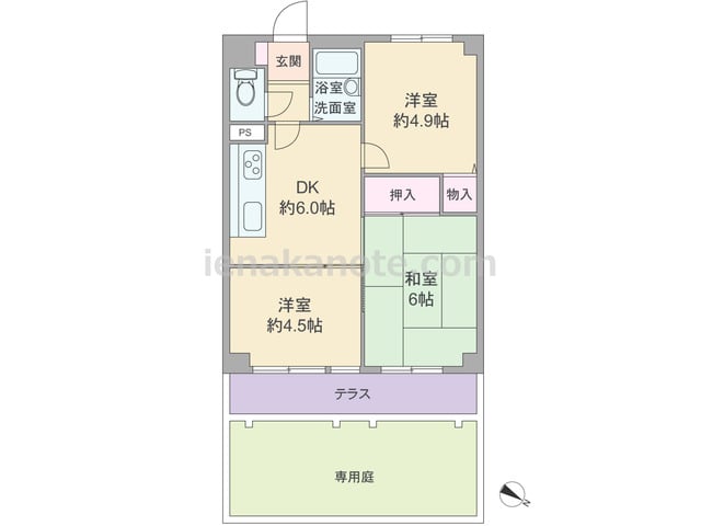 専有面積41.12平米の3DK。専用庭付きのプラン。室内廊下の面積が少ない、居住空間を優先した造り。DK約6.0帖に隣接する洋室約4.5帖には収納スペースがありませんが、扉を開放すれば、約10.5帖のLDKとして使う事が出来ます。和室6帖...