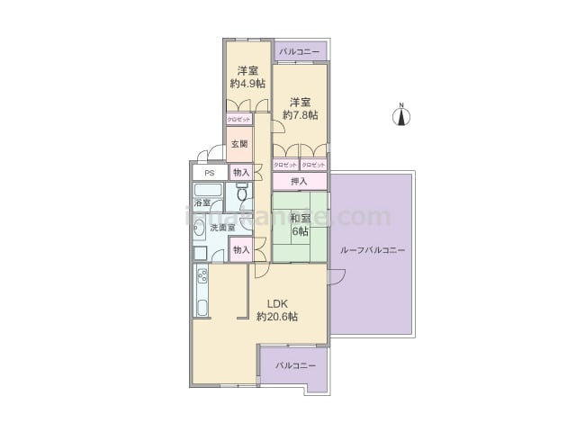 専有面積89.22平米の3LDK。ルーフバルコニーが付いたセンターインのプラン。LDKは広々約20.6帖大。生活感の出やすいキッチンは独立型のため、リビングスペースはくつろぎの空間を保つ事ができます。キッチンと洗面室は家事効率の良い2WA...