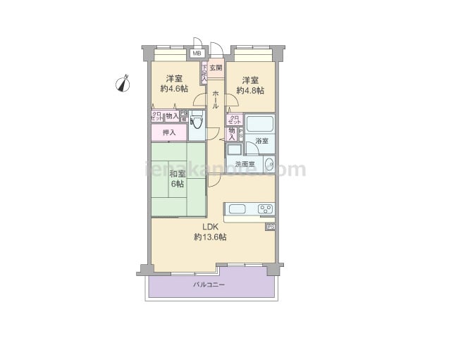 専有面積63.91平米の3LDK。LDK約13.6帖にはコーナーサッシが用いられ、明るく開放感があります。カウンタータイプのキッチンは家事をしながらリビングダイニングを見渡せる配置。和室6帖の襖を開放すれば、LDK約19.6帖大としても利...