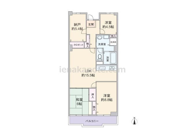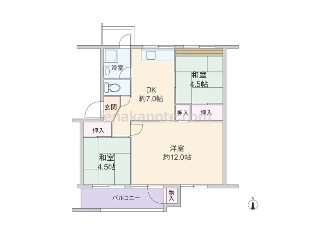 専有面積54.12平米の3DK。南北両面に窓がある、ワイドスパンのプラン。どの部屋もDK約7.0帖を通って出入りします。主寝室は広々約12.0帖大。北側和室4.5帖には家具を置くのに便利な板間があります。各個室と南側バルコニーに収納スペー...