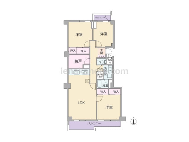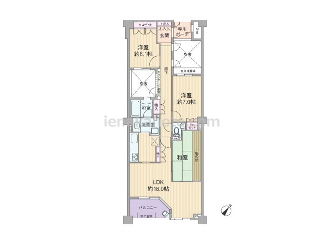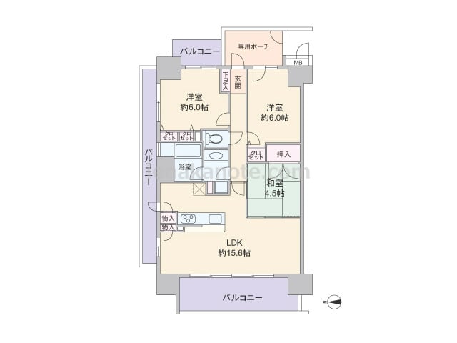 専有面積70.04平米の3LDK。玄関前に専用ポーチがあり、共用廊下に居室の窓が直接面していない、プライバシー重視のプラン。LDKは約15.6帖、対面タイプのキッチンは物入やバルコニーへの勝手口付き。和室4.5帖は室内廊下とLDKの2カ所...