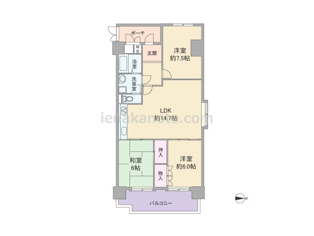 専有面積71.88平米の3LDK。玄関前にはプライバシーに配慮された専用ポーチがあります。センターリビングのプランで、LDKは約14.7帖、キッチンはI型の壁付け・オープンタイプ。主寝室約7.5帖には収納スペースが無いため、家具を置くなど...