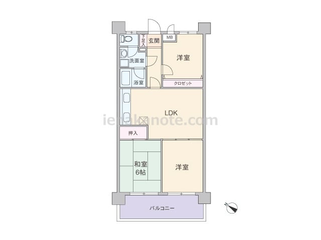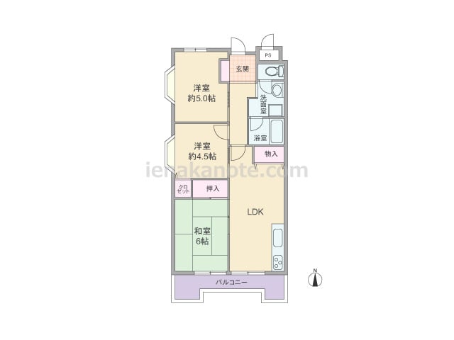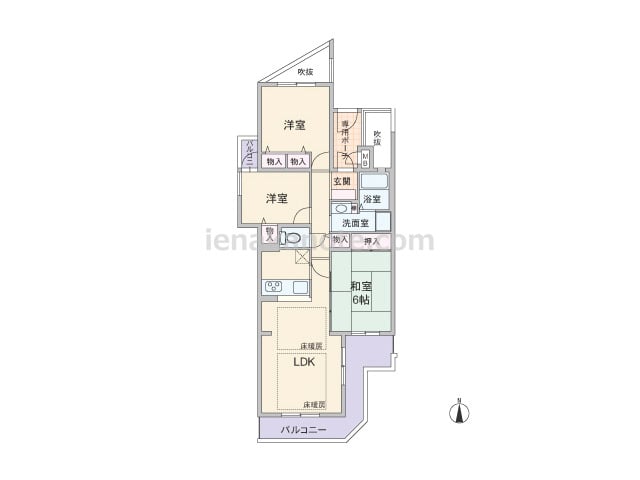 専有面積57.31平米の3LDK。LDKと洋室約4.5帖、和室6帖が続き間になったプラン。洋室約5.0帖には収納スペースが無いため、場合により家具の設置が必要です。トイレは洗面室を通って出入りする造り。トイレ・洗面室使用時の動線が重なって...