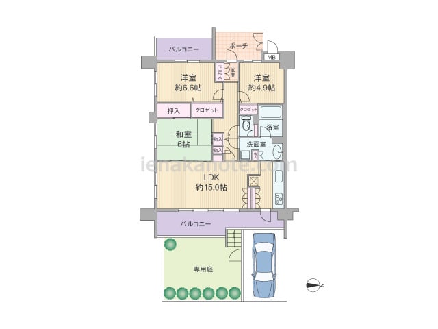 専有面積75.38平米の3LDK。専用ポーチや専用庭が付いた戸建感覚のプラン。LDK約15.0帖には和室6帖が隣接しており、襖を開放すれば約21.0帖大の空間としても使用可能。キッチンは洗面室・バルコニーへアクセスでき、家事効率の良い造り...