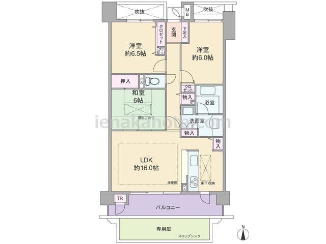 専有面積77.04平米の3LDK。共用廊下と居室の間に吹抜がある、プライバシー性の高いプラン。LDK約16.0帖には床暖房が、和室6帖には掘りごたつがあります。キッチンはリビング・ダイニングを見渡せる対面カウンタータイプで、バルコニーへア...