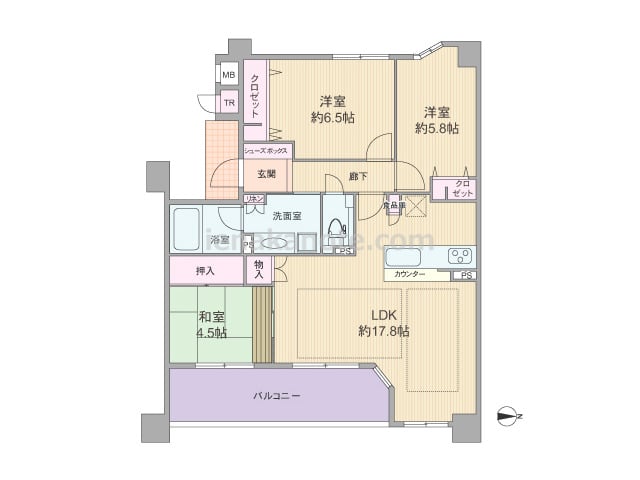 専有面積76.71平米の3LDK。玄関前にトランクルーム付き。LDKは約17.8帖大とゆとりがあり、和室の襖を開放すれば約22.3帖大の空間に。キッチンはリビング・ダイニングを見渡せる対面カウンタータイプです。収納スペースが充実しており、...