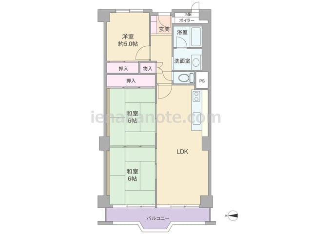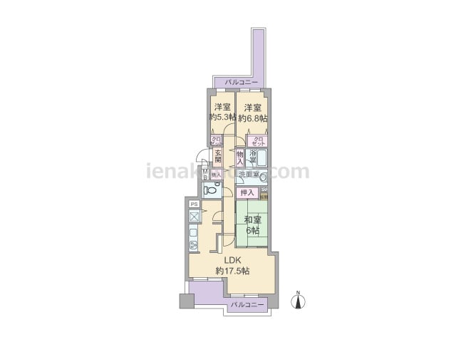 専有面積68.8平米の3LDK。玄関前に専用ポーチ付き。居室の窓が共用廊下に面していない、プライバシー重視のプランです。対面・カウンター式のキッチンも洗面室へアクセス可能。主寝室約8.0帖へはLDKを通って行き来し、和室6帖は室内廊下とL...