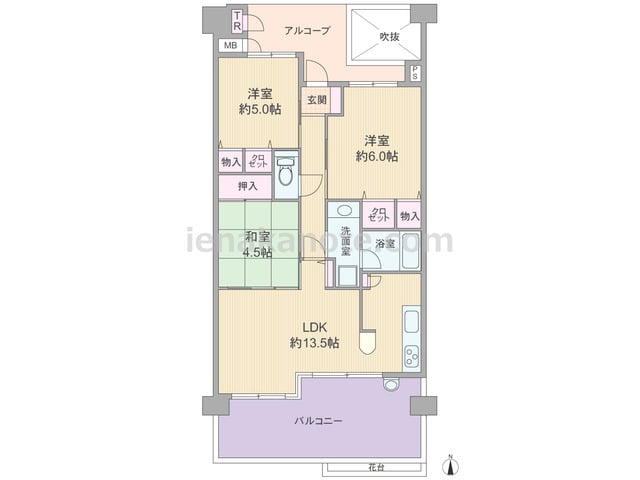 専有面積64.74平米の3LDK。玄関前にアルコーブ、トランクルーム、吹抜があります。LDKは約13.5帖、キッチンはI型・ウォールタイプ。LDKと和室4.5帖の間の襖を開放すれば、約18.0帖大の空間としても使えます。収納スペースが各所...