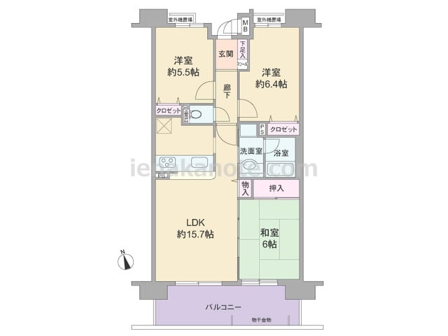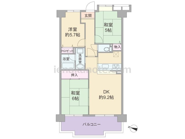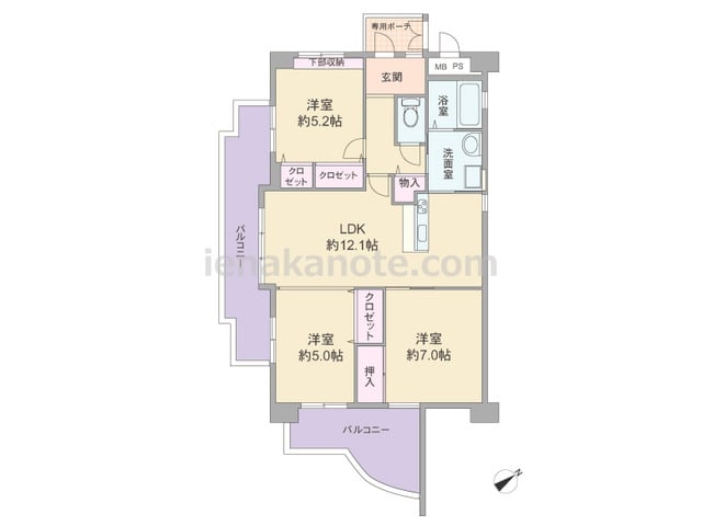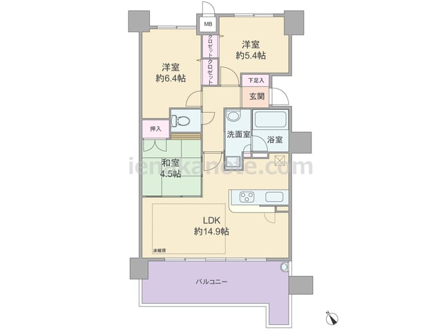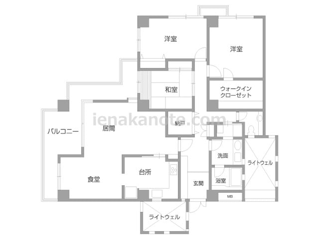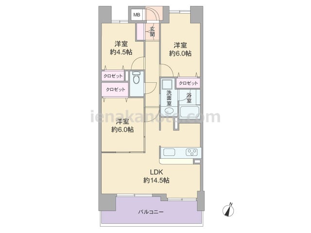 3SLDKのプラン。共用廊下に直接面する居室の窓が無い、プライバシー重視の造りです。玄関には親子扉が用いられています。リビングには明るく・開放的なコーナーサッシが用いられ、独立型のキッチンはリビング・ダイニングに生活感が伝わりにくいのが特...