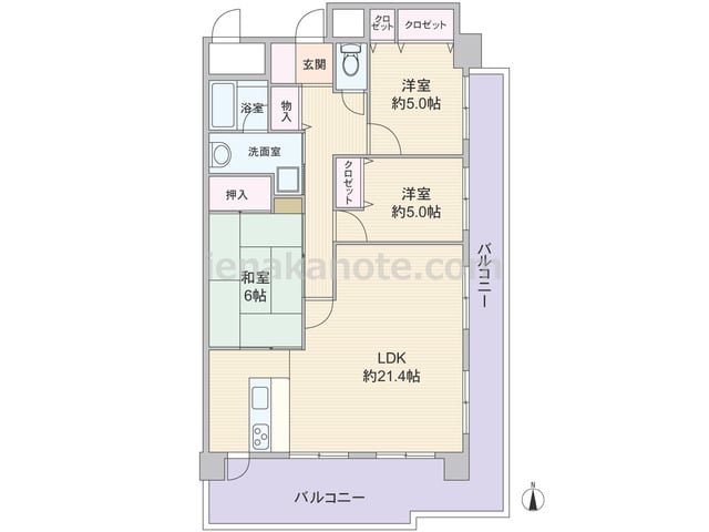 専有面積83.41平米の3LDK。居室の窓が共用廊下に面していない、プライバシーが確保されたプラン。二面採光のLDKは約21.4帖大の広さがあり、対面カウンタータイプのキッチン横にはバルコニーへの勝手口があります。和室6帖はキッチン横と室...