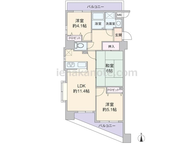 専有面積60.01平米の3LDK。南北両面にバルコニーがあるセンターインのプラン。LDKは約11.4帖、キッチンはリビング全体を見渡せる対面カウンタータイプの仕様。隣接する和室の引き戸を開放すれば、LDKをより広々と使う事が出来ます。洋室...