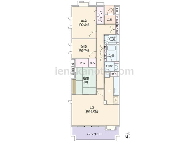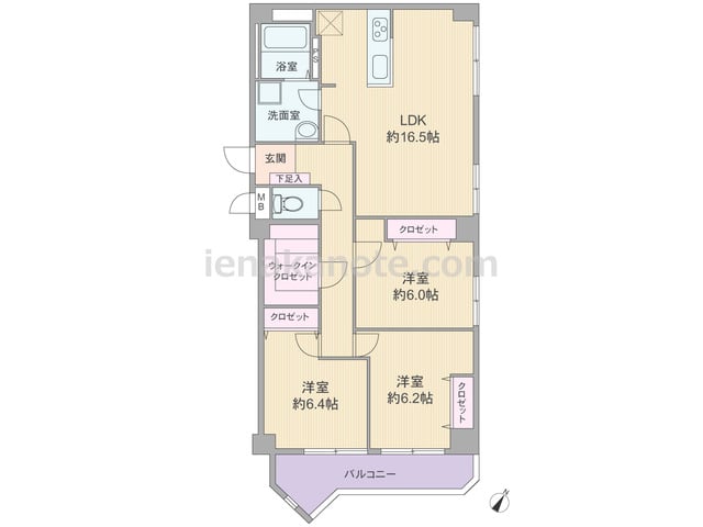 専有面積76.39平米の3LDK。横長リビングのプラン。LDKは約16.3帖、隣接する和室6帖は室内廊下からも出入りが可能。ウォールタイプのキッチンは背面にカウンターがあり、洗面室へアクセス可能な家事動線のよい造りです。収納が各所にあるの...