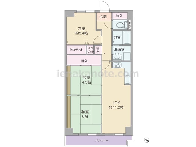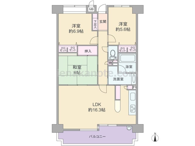 専有面積104.94平米の3LDK。居室の窓が共用廊下に面しておらず、玄関先から室内を見通せない、プライバシーを保ちやすいプラン。生活感の出やすいキッチンはリビング・ダイニングから独立しており、キッチン横に洗濯機置場があります。和室6帖は...