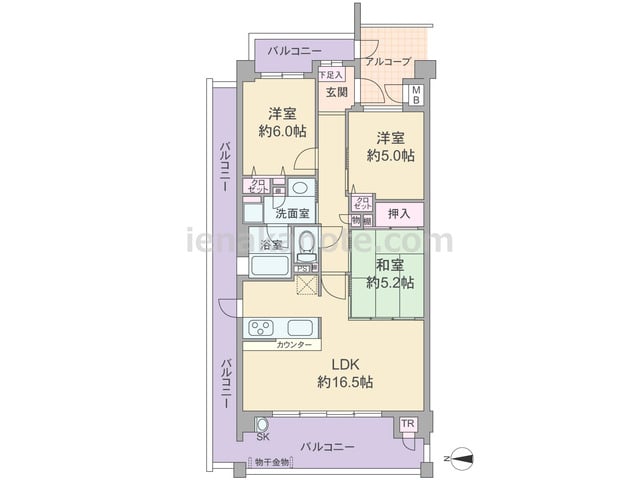専有面積74.01平米の3LDK。玄関前にアルコーブがあり、玄関先から室内を直接見通せない、プライバシーに配慮されたプラン。LDK約16.5帖には和室5.2帖が隣接し、引き戸を開放すれば約21.7帖大の空間にする事が出来ます。和室は室内廊...