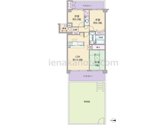 専有面積67.74平米の3LDK。専用庭、専用ポーチが付いた戸建感覚のプラン。居室の窓が共用廊下に直接面していないため、プライバシーを保ちやすい造りです。LDKは約14.9帖、キッチンは対面カウンタータイプ。和室6帖には掘りごたつが設けら...