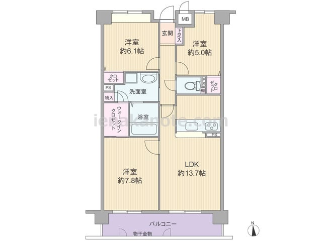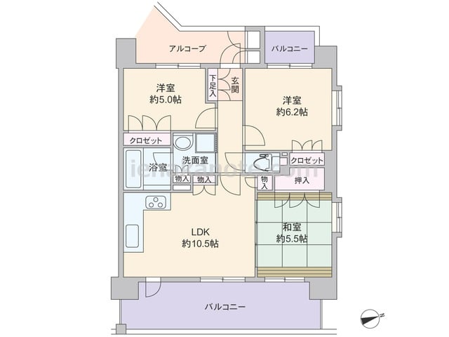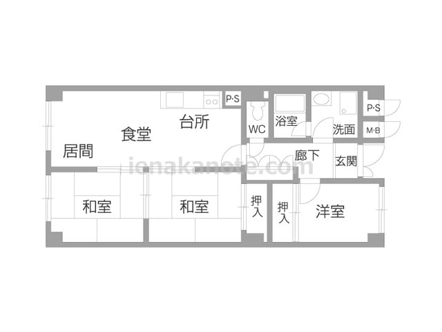 専有面積60平米の3LDK。玄関前にアルコーブがあり、共用廊下に直接面する窓が無い、プライバシーを保ちやすいプラン。キッチンはL字形で、LDK内に物入が2カ所設けられています。LDKと続き間の和室の引き戸を開放すれば、約16.0帖大の空間...