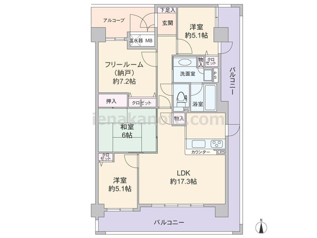 専有面積88.35平米の3SLDK。玄関前にアルコーブが設けられています。LDKは約17.3帖、対面キッチンにはバルコニーへの勝手口が付いた家事効率の良い造り。LDKを通ってアクセスする洋室約5.1帖を子供部屋にすれば、コミュニケーション...