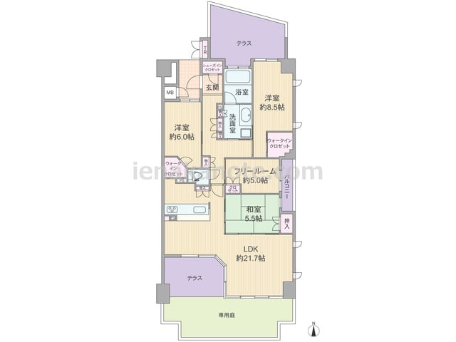 専有面積105.63平米の3SLDK。共用廊下に直接面する窓が無い、プライバシーが確保されたプラン。LDK約21.7帖には明るく開放的なコーナーサッシが用いられており、和室の引き戸を開放すれば約27.2帖大の空間にする事が可能。キッチンは...