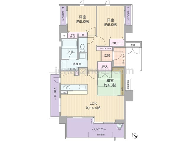 専有面積65.96平米の3LDK。共用廊下に面する居室の窓がない、プライバシー性の高いプラン。玄関先から室内が見通せないのもポイントです。コーナーサッシが用いられたLDK約14.4帖には和室約4.3帖が隣接し、和室の板畳は家具を置くのに便...