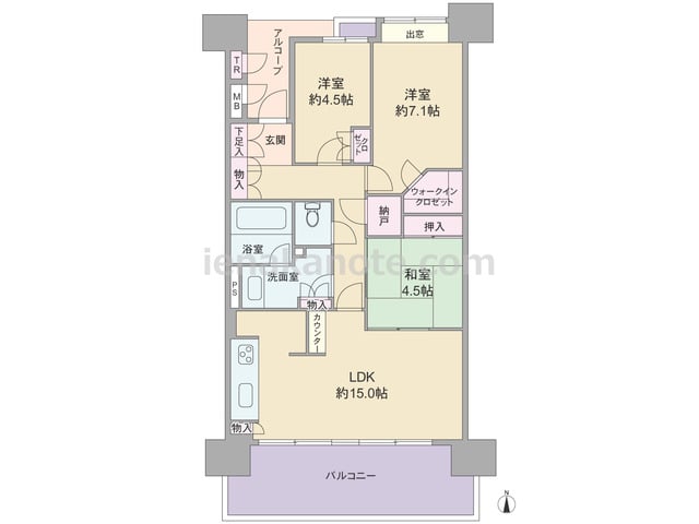 専有面積76.53平米の3LDK。玄関前にアルコーブとトランクルームがあり、玄関先から室内が見通せない造り。LDK約15.0帖に隣接する和室4.5帖は室内廊下からも出入りが可能。キッチンはI型のウォールタイプです。主寝室約7.1帖にはウォ...