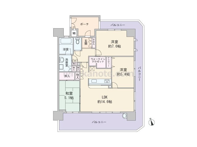 専有面積72.30平米の3LDK。玄関前に専用ポーチがあり、全居室バルコニーに面した明るく・開放感のあるプラン。LDKはゆとりの約14.6帖大。和室5.1帖の襖を開放すればより広くリビングダイニングを使う事が出来ます。キッチンは家事をしな...