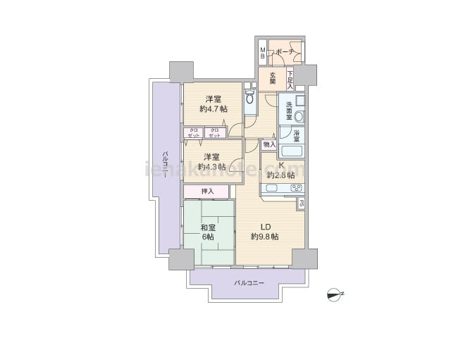 専有面積63.73平米の3LDK。共用廊下に居室の窓が直接面しておらず、玄関前に専用ポーチが付いたプライバシー重視のプラン。生活感を感じさせやすいキッチンは独立した配置ながら、キッチンカウンターがあるため、作業をしながら家族とコミュニケー...