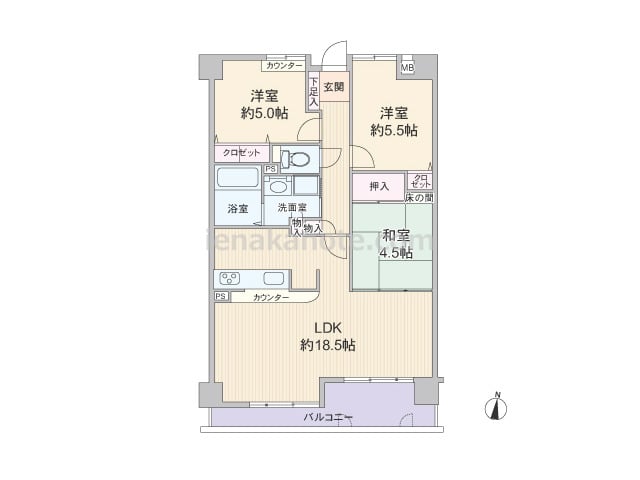 専有面積68.72平米の3LDK。LDKは約18.5帖大とゆとりがあり、キッチンは家事をしながらリビングの様子を伺えるカウンタータイプ。和室4.5帖の襖を開放すれば、LDKは約23.0帖大の空間としても使う事が出来ます。各所に収納スペース...