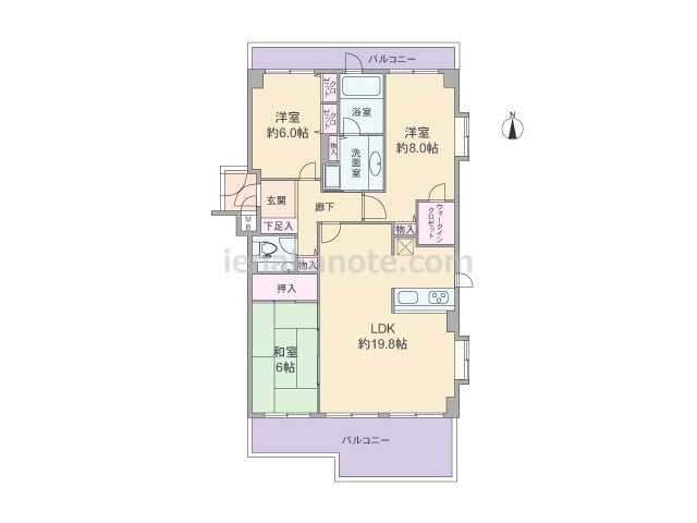 専有面積86.23平米の3LDK。センターインのプランで、南北両面にバルコニー付き。全居室がバルコニーに面しており、LDKと主寝室約8帖は開放感のある二面採光。キッチンは家事中も家族に目が届くI型の対面式。LDKと和室をつなげて、約25....