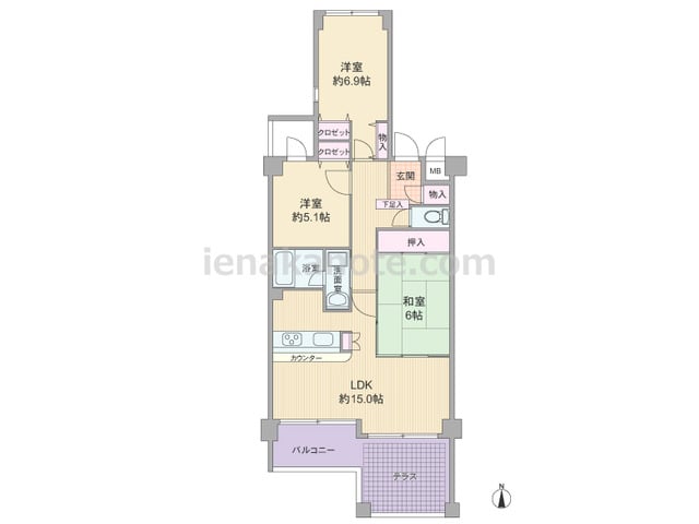 専有面積70.51平米の3LDK。玄関前にアルコーブ付き。キッチンはI型・カウンタータイプで、洗面室へも出入りが可能な家事効率の良い造り。和室6帖は家族団欒のリビングスペースに利用したり、おもちゃを置いて小さい子どもの遊び場やお昼寝スペー...