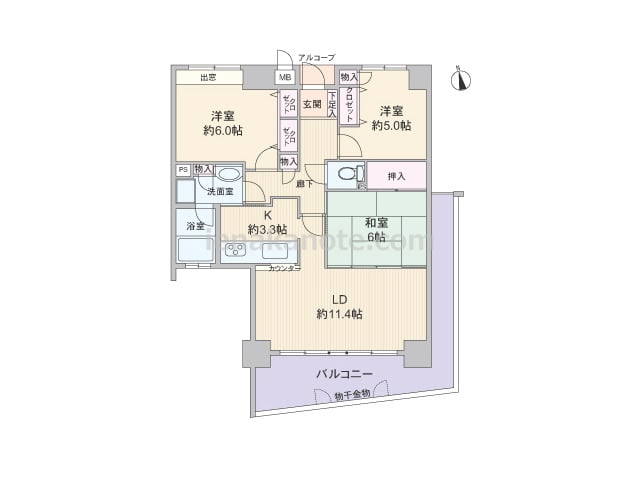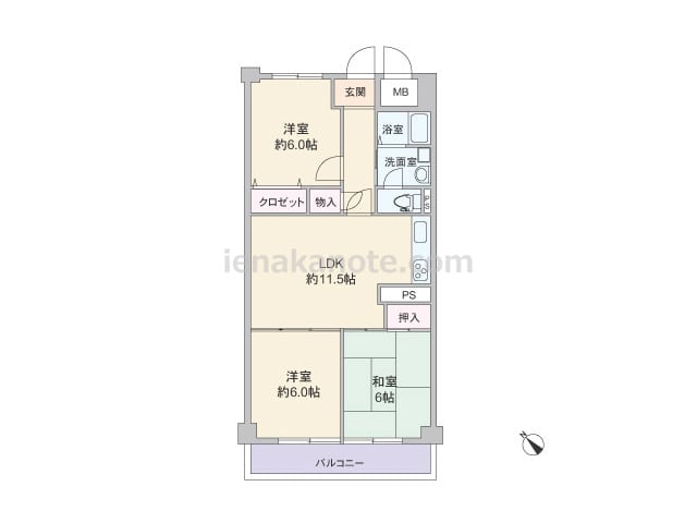専有面積66.00平米の3LDK。全室6帖以上のゆとりあるプラン。LDKは約11.5帖、キッチンはI型の壁付け・オープンタイプ。LDKと続き間になった洋室約6.0帖には収納スペースがありませんが、扉を開放すれば約17.5帖大のリビングダイ...