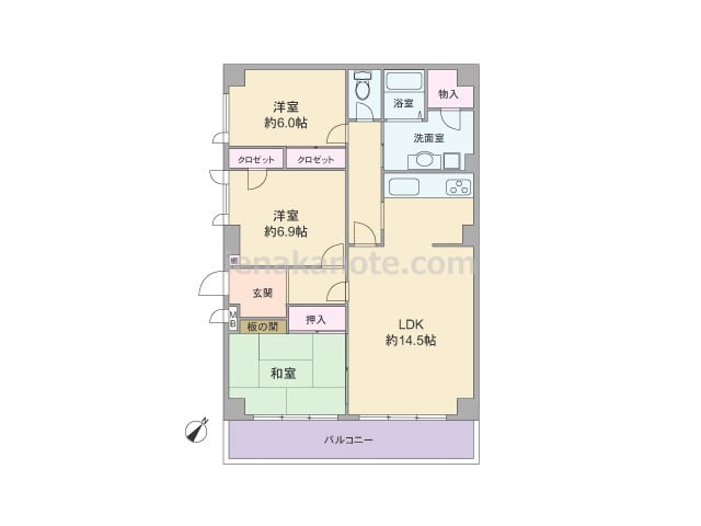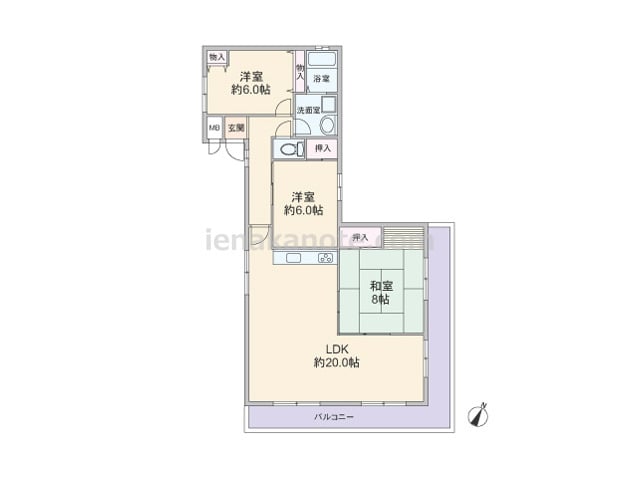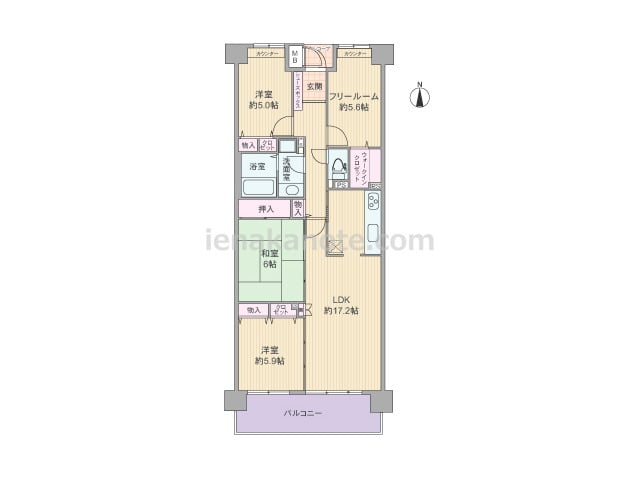専有面積92平米の3SLDK。玄関前にアルコーブがあります。LDKは広々約17.2帖大。キッチンは独立型のため、リビングダイニングはくつろぎの空間を保つ事が可能。和室6帖と洋室約5.9帖はLDKと続き間になっており、扉を開放してLDKと繋...