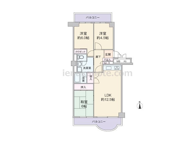 専有面積70.23平米の3LDK。全部屋バルコニーに面する、通風・採光に配慮されたプラン。LDKは約12.5帖、キッチンは壁付け・オープンタイプ。LDKと室内廊下に物入付き。洋室約4.5帖には収納スペースが無いため、収納家具を置くなど少し...
