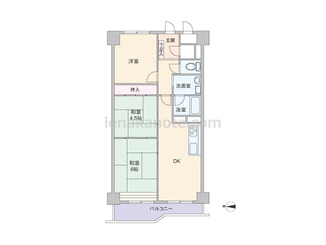 専有面積61.49平米の3DK。DKと和室2部屋が続き間になったプラン。生活シーンに合わせて、それぞれ個室に利用したり、襖を開放して空間を広く使用するなどフレキシブルに使う事が可能。収納スペースは和室4.5帖に設けられ、他の部屋では収納家...