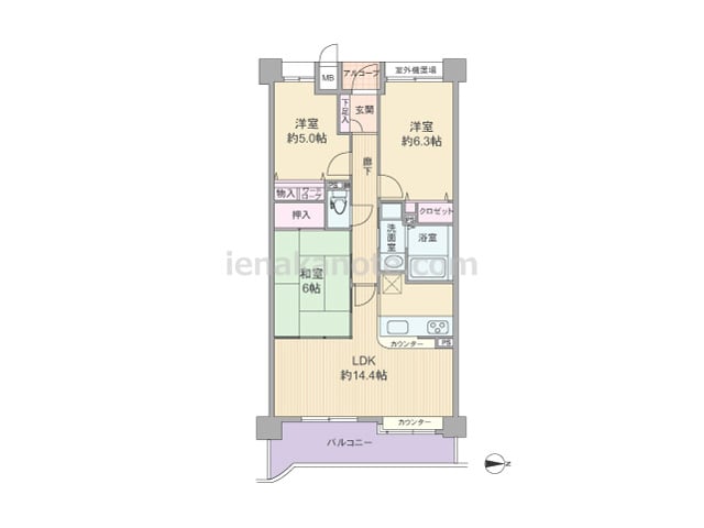 専有面積69.12平米の3LDK。玄関前にアルコーブ付き。LDKは約14.4帖、キッチンは作業しながら家族とコミュニケーションが取れるカウンタータイプ。和室6帖は2カ所から出入りでき、LDK側の襖を開放すれば約20.4帖大のLDKとして使...
