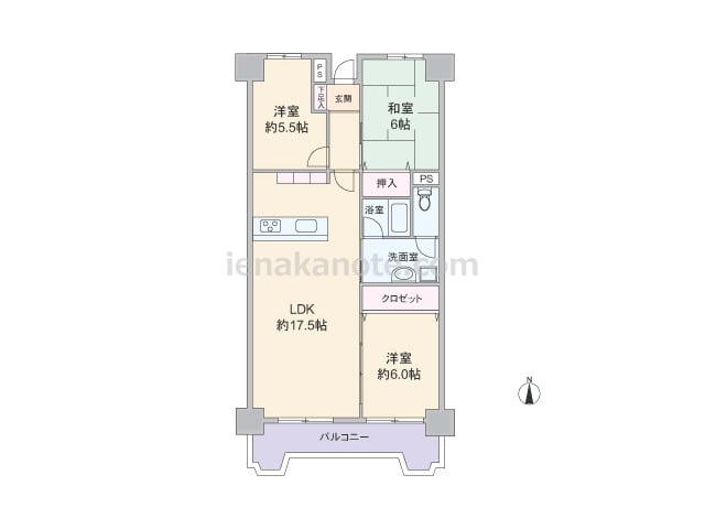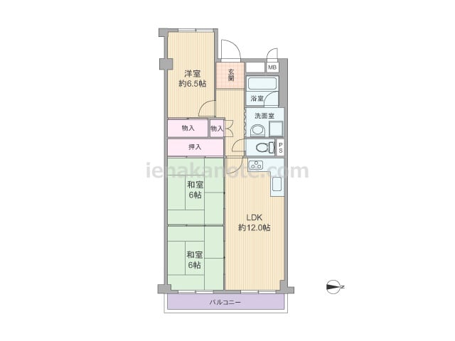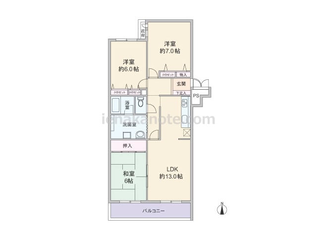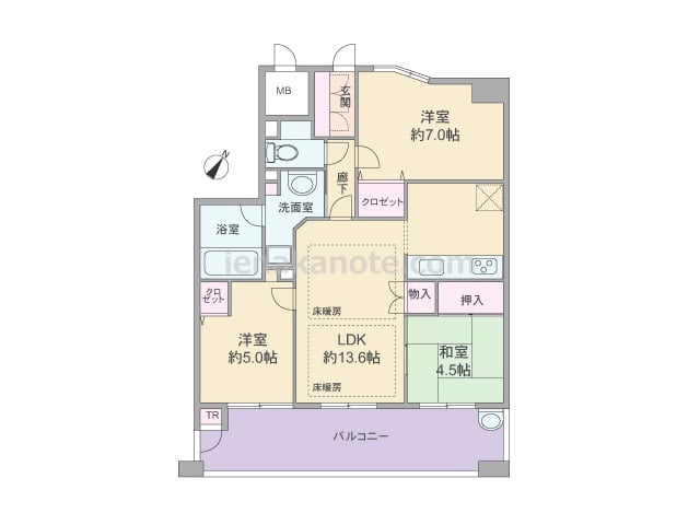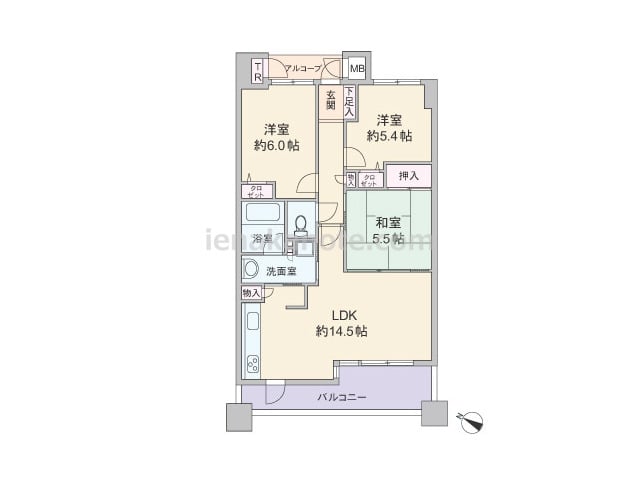 専有面積69.04平米の3LDK。玄関前にアルコーブとトランクルーム付き。LDKは約14.5帖。キッチンは壁付け・オープンタイプでバルコニー・洗面室へアクセス可能な3WAY動線。和室は2カ所から出入りでき、LDK側の襖を開放すれば約20....