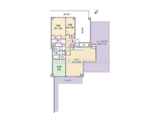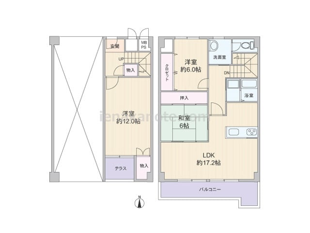専有面積94.86平米の3LDK、メゾネットタイプ。下階は主寝室約12.0帖と収納スペースがあり、上階にLDKや水周りが設けられたプラン。LDKは約17.2帖大と広く、キッチンは家事をしながら家族とコミュニケーションが取れるカウンタータイ...