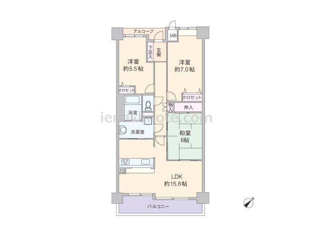 専有面積76.32平米の3LDK。玄関前にアルコーブがあります。LDKはゆとりの約15.8帖大。カウンタータイプのキッチンは作業をしながら家族とコミュニケーションが取りやすく、洗面室へも出入りが可能な2WAY動線。和室6帖は室内廊下とLD...