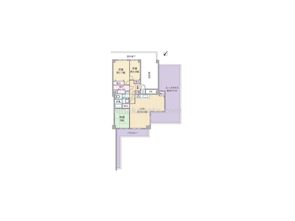 専有面積84.82平米の3SLDK。センターインのプランで、玄関には大理石が使用されています。LDKは約19帖の広さがあり、3カ所に窓が付いており開放感があります。キッチンはLDKを広く使える壁付け、I型のオープンタイプ。LDKと和室が続き間で、つなげて約25帖の一つの空間としても使用可能。各部屋の収納スペースの他、廊下に面して納戸付き。主寝室は約7.7帖大。約45平米の広々としたルーフテラスがあり、アウトドアリビングやガーデニングスペースとしても空間を楽しめます。