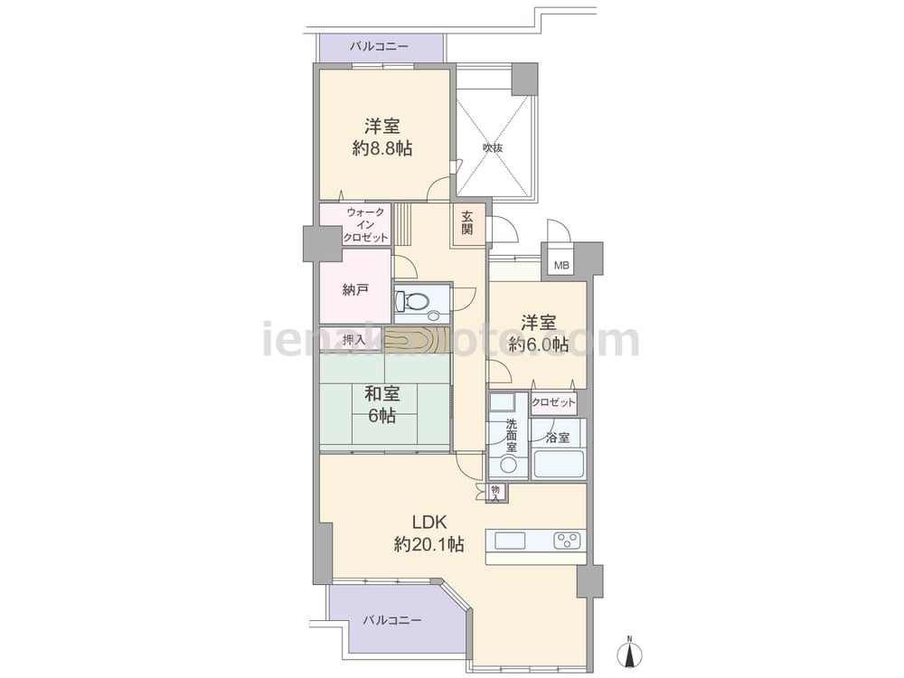 専有面積98.41平米の3SLDK。センターインで、南北両面バルコニーのため通風も良好です。共用廊下に面する居室が無く、プライバシーに配慮されています。LDKは広々20.1帖、ダイニングとリビングがゆるやかに区切られた使いやすいプラン。ウォークインクロゼットや大容量の納戸など、収納スペースが充実しています。