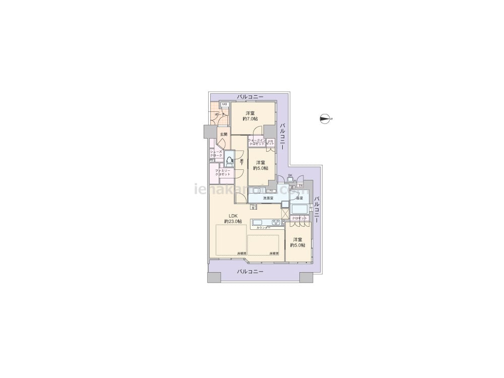 専有面積98.67平米の3SLDK。西・北・東の3面にバルコニーが付いた光あふれるプラン。玄関前に専用ポーチがあり、共用廊下に直接面した窓が無くプライバシーが確保されています。ワイドスパンのLDKは約23.0帖大と開放感があり、カウンタータイプのキッチンは家事をしながら家族とコミュニケーションが取りやすい配置。キッチンから洗面室、洗面室からバルコニーへ行き来でき家事動線にすぐれています。各部屋の収納の他、シューズクローク、ファミリークロゼット、バルコニーにトランクルーム付き。浴室の窓は換気がしやすく快適です。約40.66平米の広さがあるバルコニーにはスロップシンクがあり、ガーデニングはもちろん、キッチンの流し台や洗面室では洗いにくい汚れ物などを扱うのにも利用出来ます。